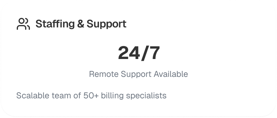 Whether you’re experiencing staffing shortages or an influx of new patients, our flexible model provides top‐tier coders and billing experts to fill resource gaps. We manage staff absences (retirement, PTO, sickness), handle work authorizations, and ensure continuous service without compromising on quality or compliance