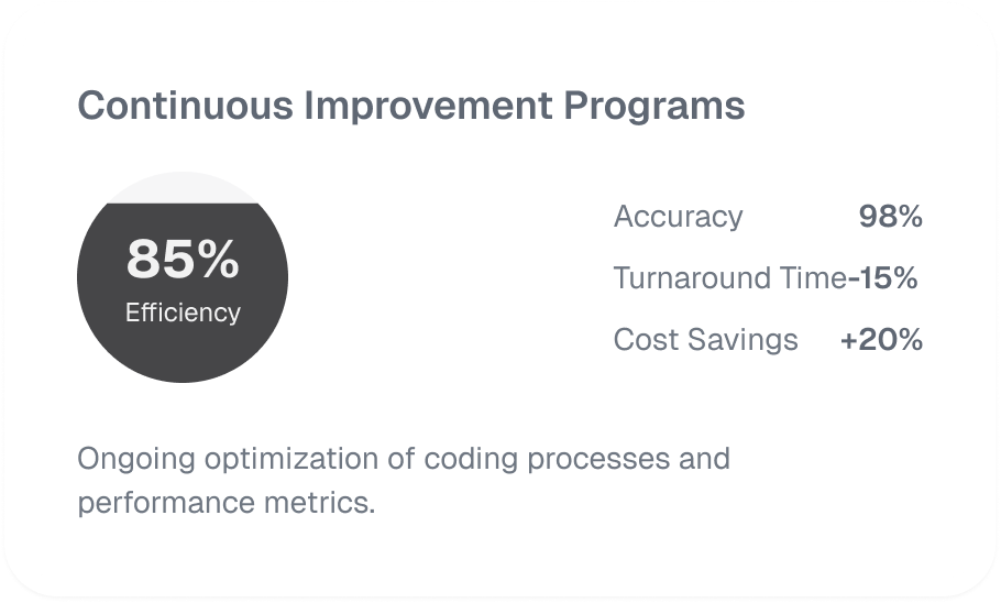 Our team conducts ongoing coding audits and performance assessments, ensuring your operations remain adaptable to ICD‑10 changes, payer rule updates, and compliance mandates