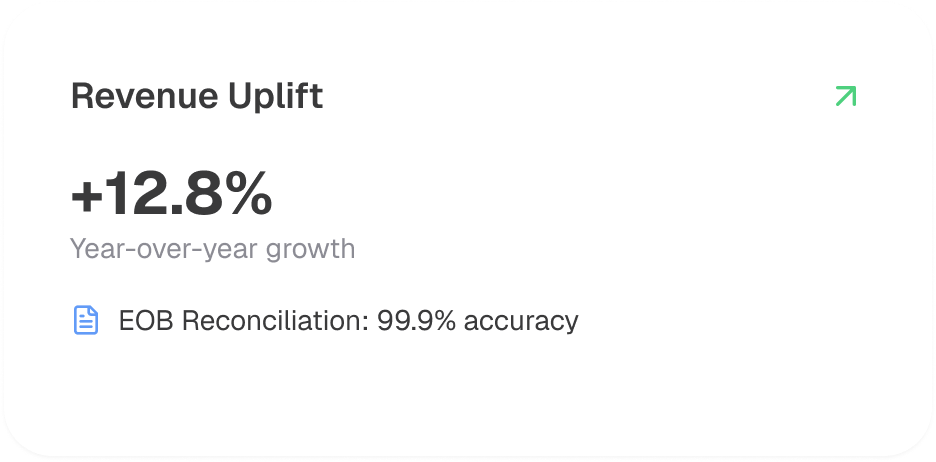 We promise a noticeable increase in revenue within 90 days, typically 10%–20% or more, by optimizing your clean claim submission and workflow efficiencies. Our near‐instant EOB reconciliation process ensures you’re paid accurately and promptly keeping your practice’s cash flow healthy while reducing administrative burdens