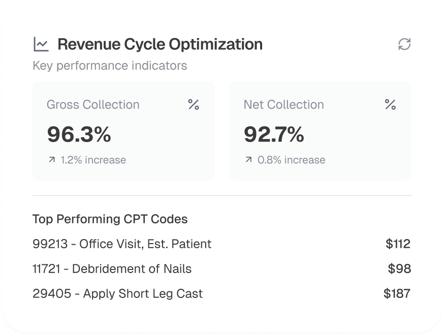 Our tailored billing solutions streamline podiatry billing workflows, enhance revenue cycle performance, and reduce administrative tasks for podiatric practices