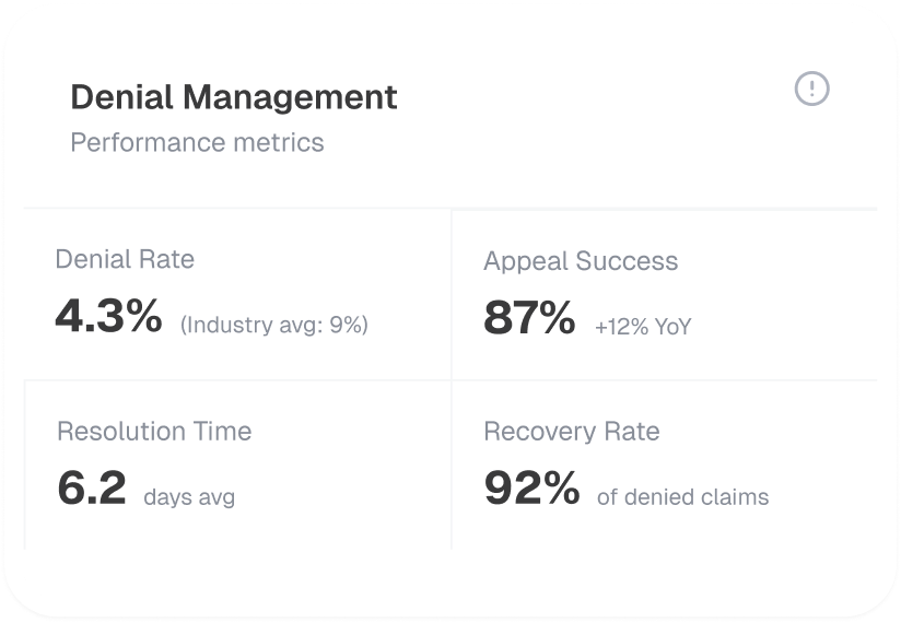 Our proactive approach identifies and resolves potential billing issues ahead of claim submission, drastically reducing denials and accelerating revenue cycles