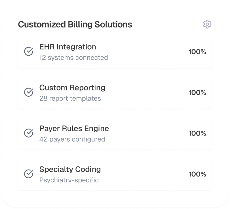 Tailored billing strategies aligned with your psychiatric practices unique requirements, boosting operational efficiency and profitability