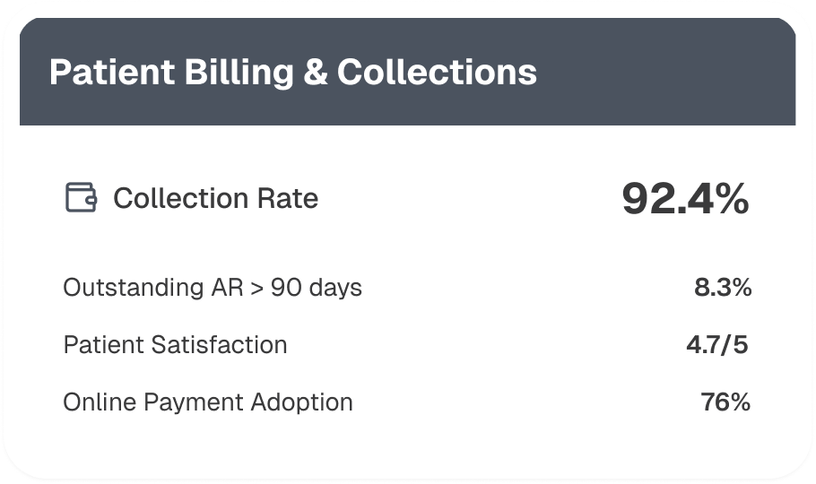 Our clear, patient-friendly billing practices streamline collections and reduce outstanding receivables, enhancing patient satisfaction and practice revenue