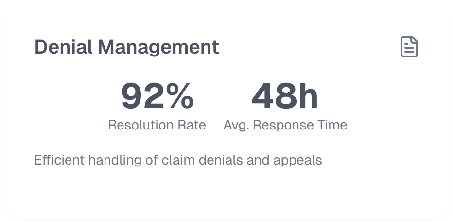 Our dedicated denial management strategies address authorization lapses, coding errors, out‑of‑network issues, and more. By analyzing root causes and implementing proactive solutions, we reduce AR days and increase revenue capture